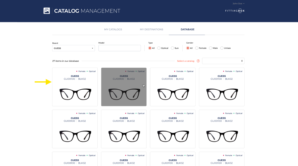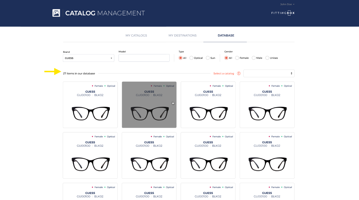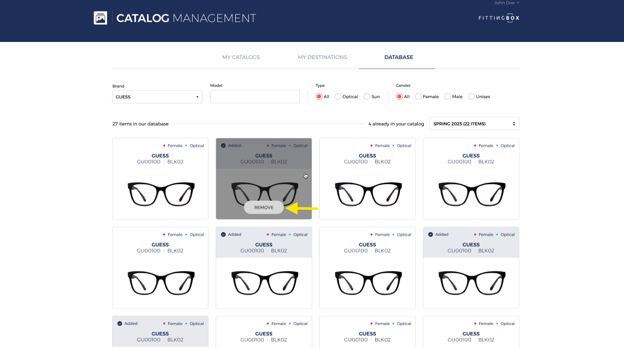 Lorsque vous recherchez une marque dans la base de données, les articles déjà ajoutés à votre catalogue seront toujours affichés.