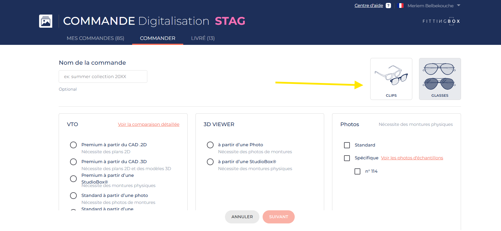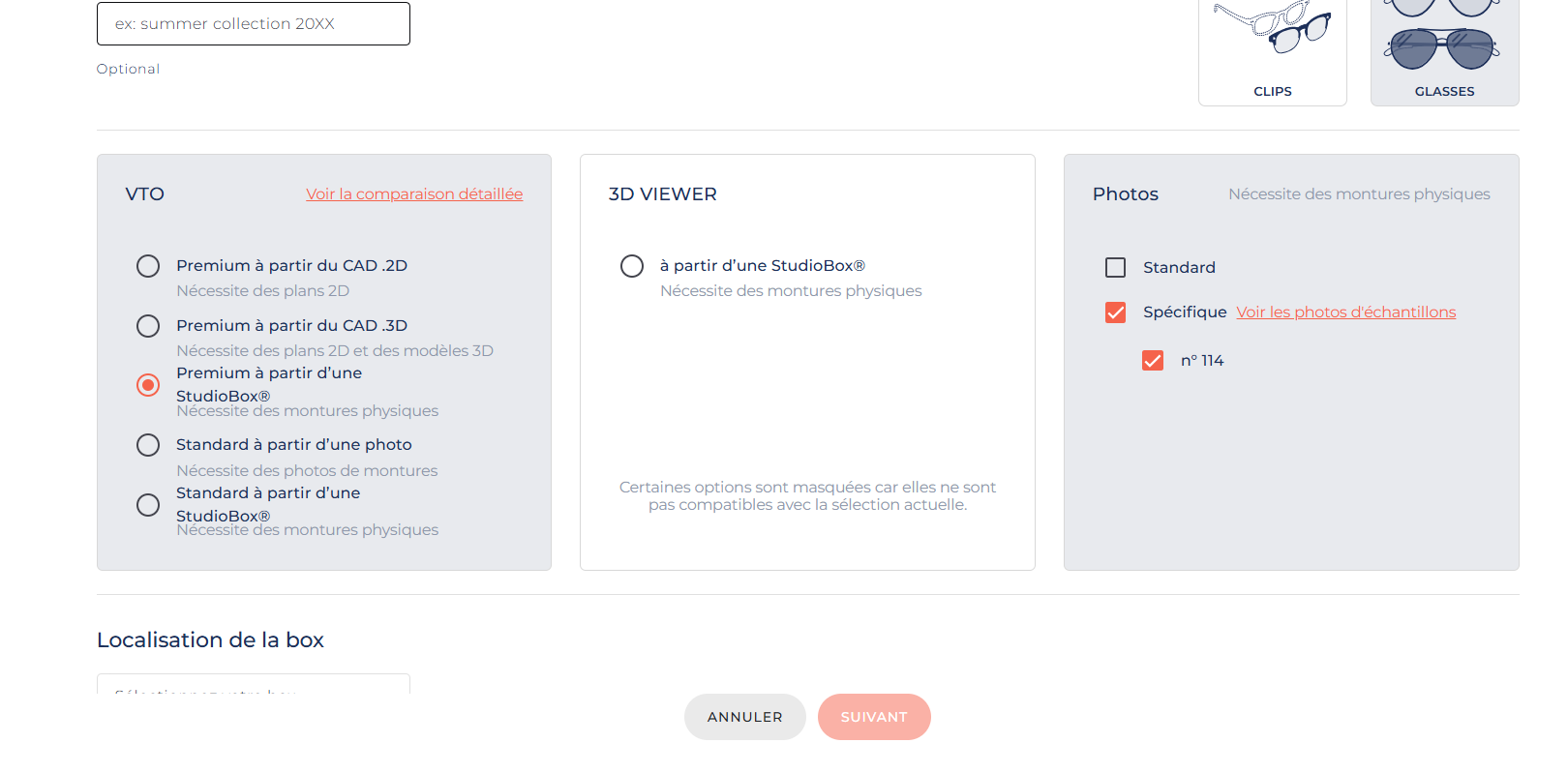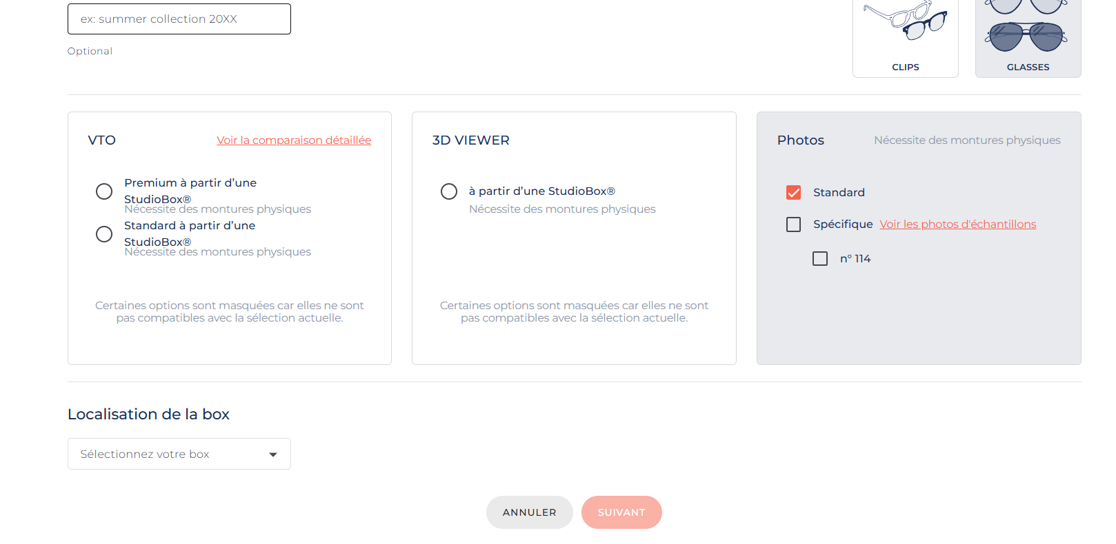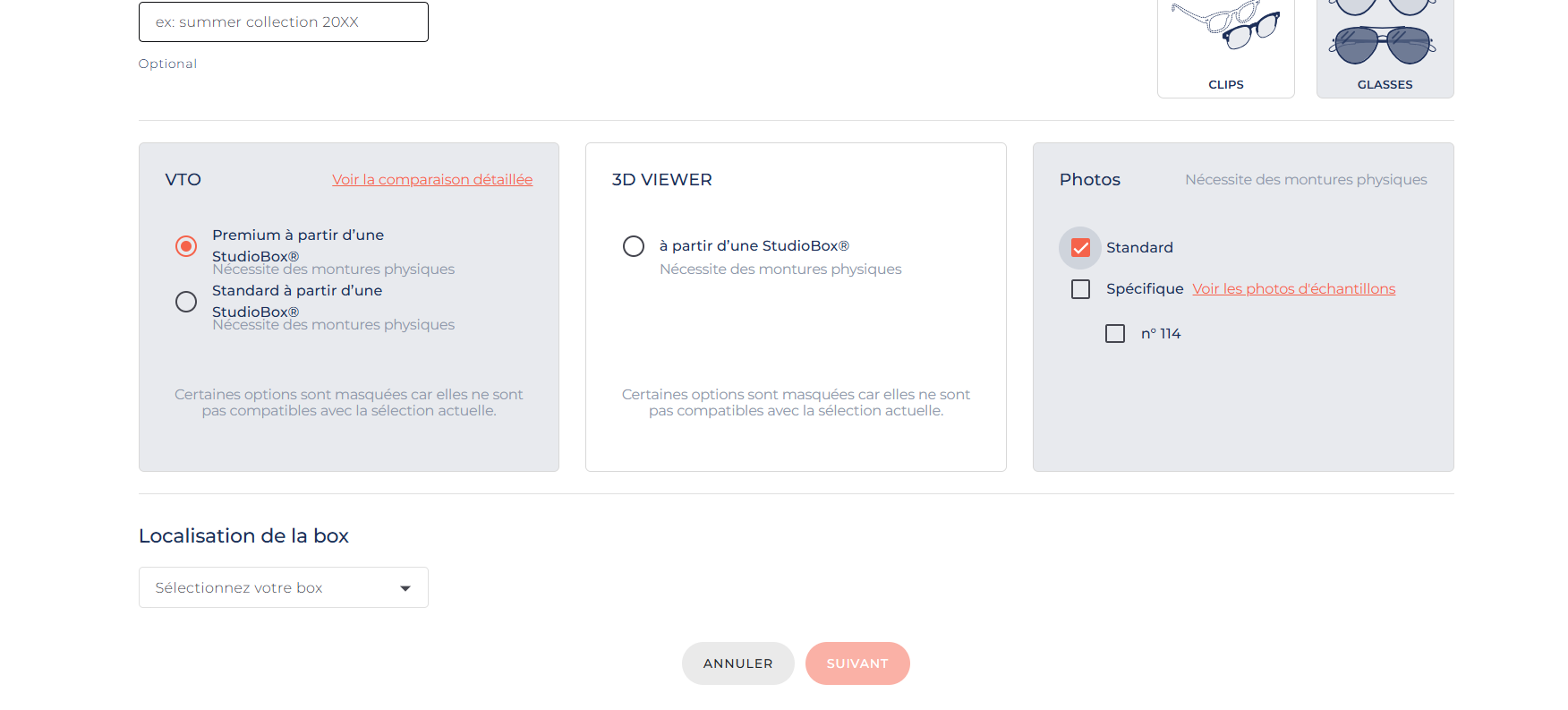 Si vous êtes sur le type "Lunettes", vous pouvez passer à Clips, mais notez que votre configuration sur Lunettes (si vous avez fait une sélection) n’est pas enregistrée. Vous devrez re-sélectionner vos services si vous revenez de Clips à Lunettes.