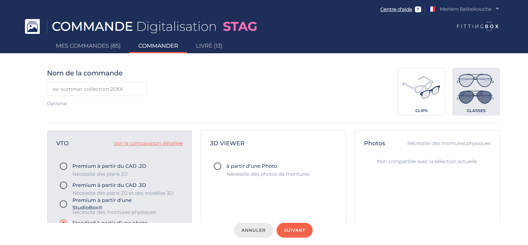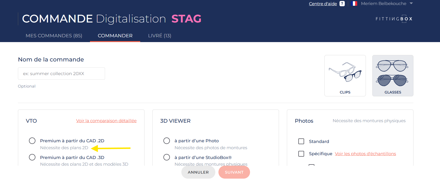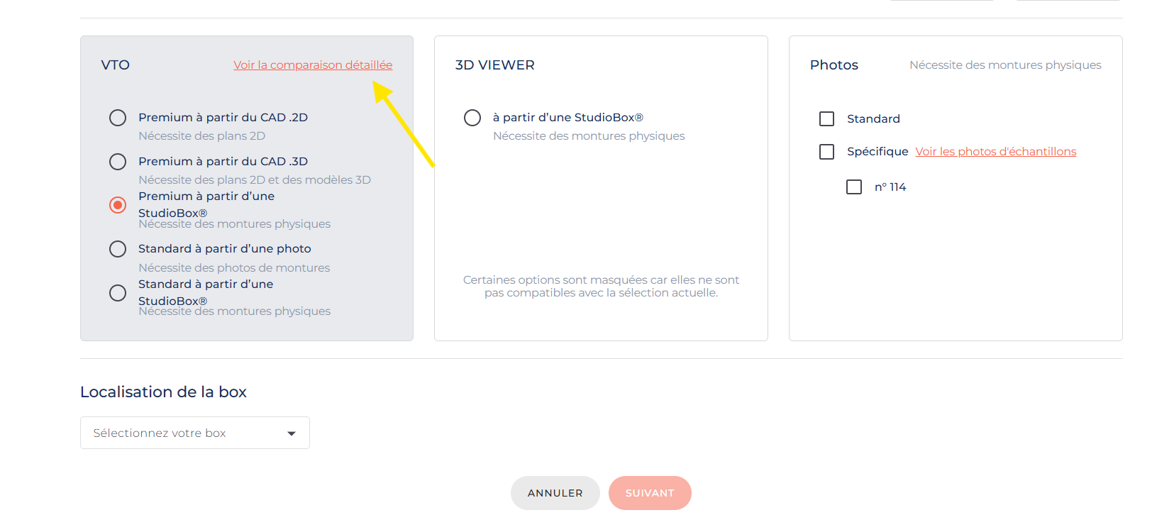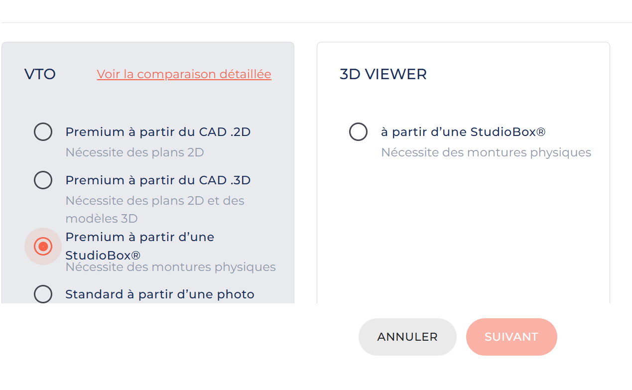 Si vous avez à la fois VTO et Photos, les services VTO auxquels vous avez souscrit seront à gauche, tandis que les services Photos (standard et/ou spécifiques) seront à droite.