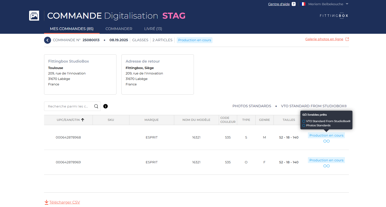Dans l’exemple suivant, vous pouvez voir que quatre services ont été commandés dans la même commande : Photos standards + Photos spécifiques + VTO standard depuis Studiobox + Visionneuse 3D depuis Studiobox. En survolant le statut, vous verrez :