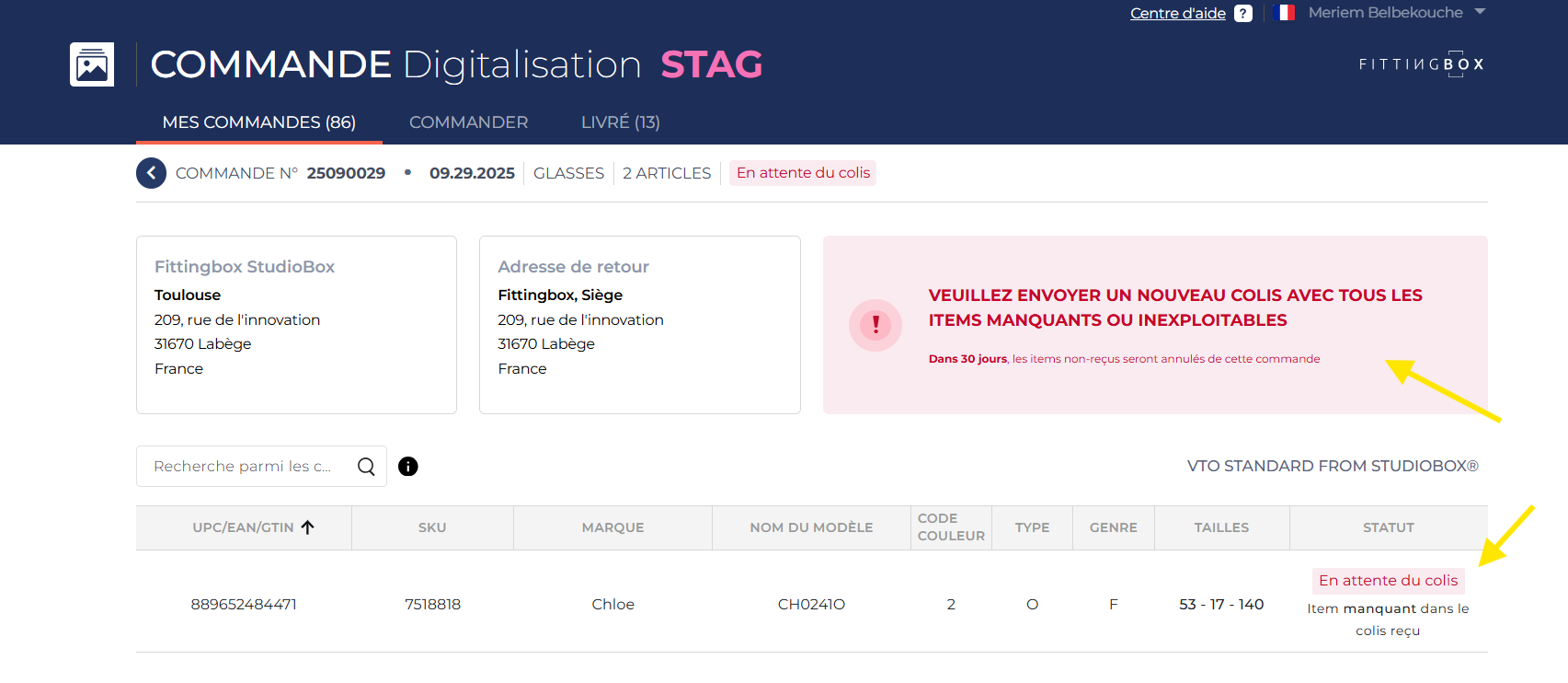 Lorsque la commande est reçue par l’équipe logistique de Fittingbox, si des articles sont manquants ou inutilisables, vous recevrez une notification par e-mail.