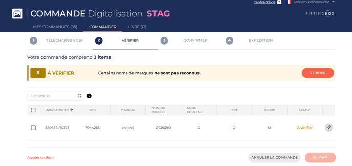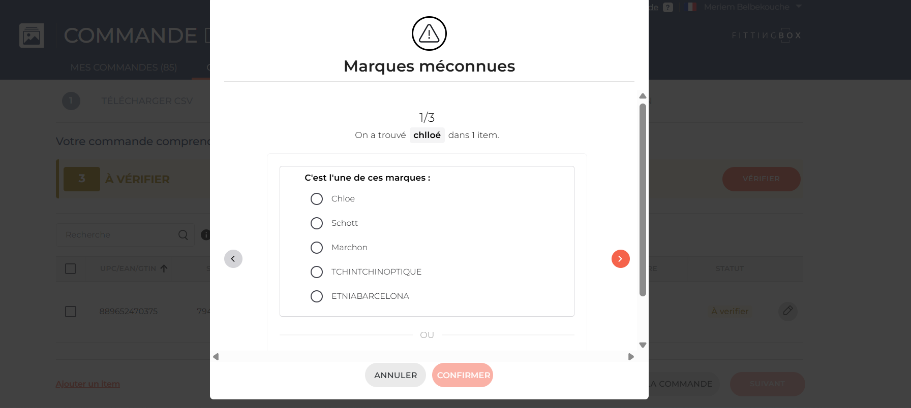 - Pour corriger le nom de marque qui n’a pas été reconnu, cliquez sur Vérifier. Une fenêtre contextuelle s’ouvre donc (voir exemple ci-dessous). Deux solutions possibles :