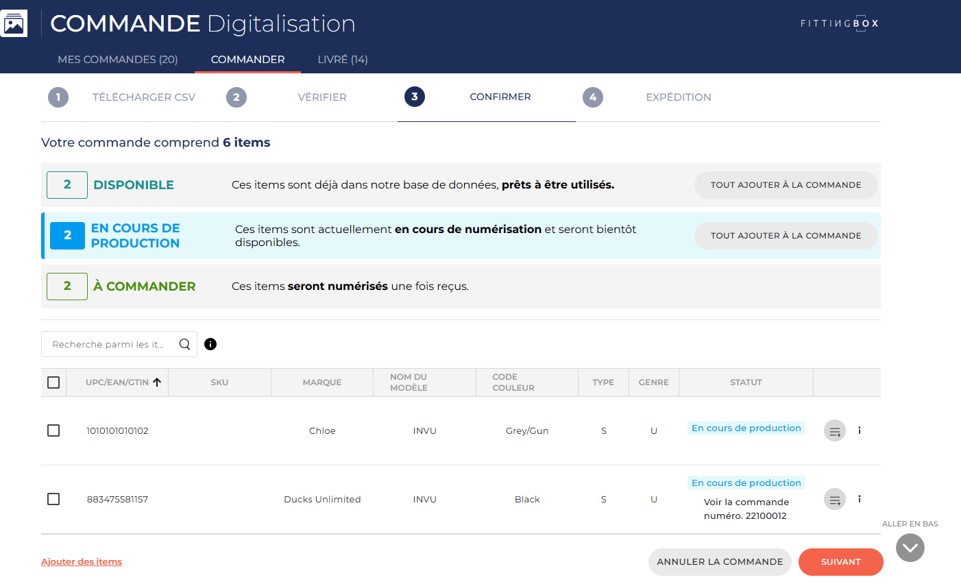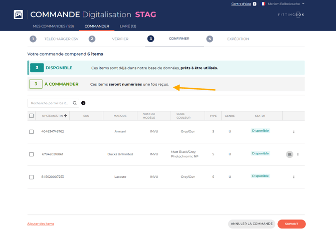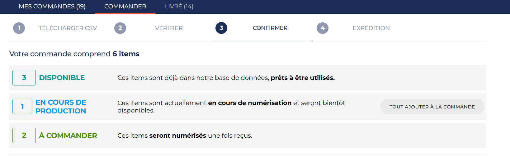 Au-dessus du tableau, trois statuts peuvent s’afficher, selon votre CSV, indiquant l’état actuel des articles commandés.