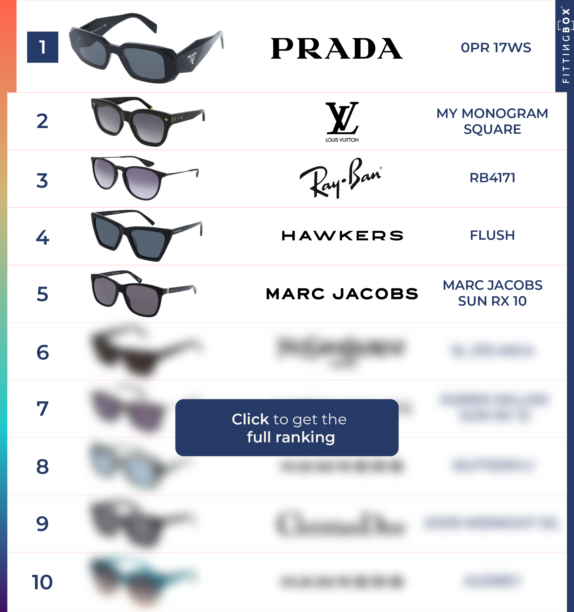 Take a look below to discover the most tried sunglasses by category: for women, men or both. Try them on in real time and fill in the form to get the full top 10 by gender 😉
