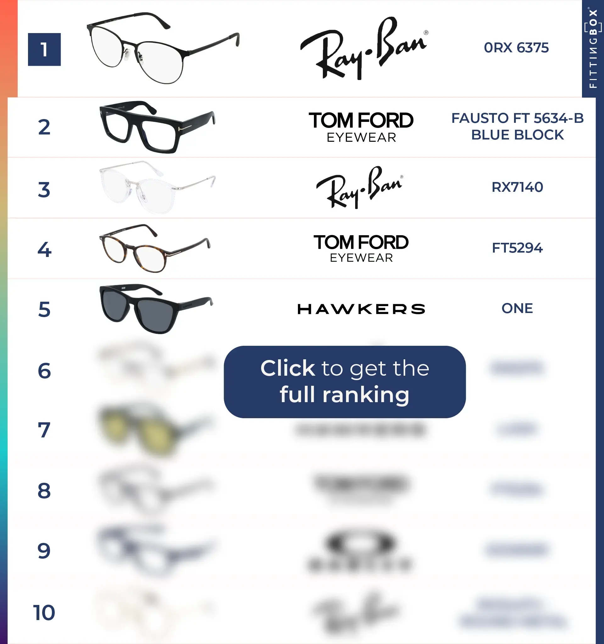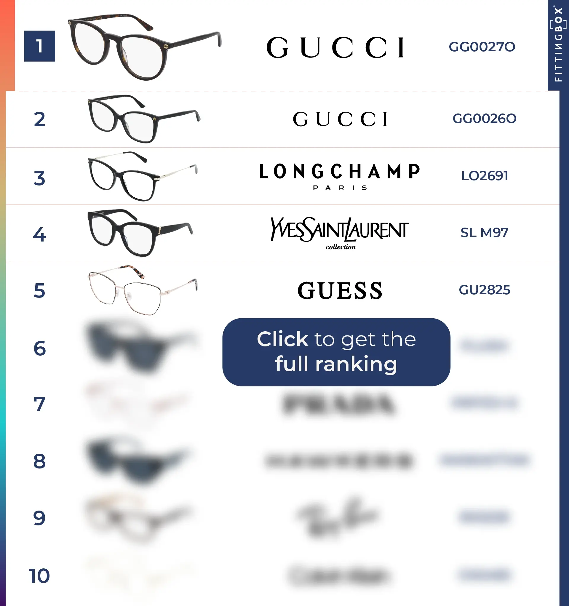 Fittingbox is the world leader in Virtual Try-On for eyewear. Every year, we count over 215 million virtual try-ons around the world. This major figure allows us to rank, each quarter, the 10 most virtually tried on frames by our end-users.