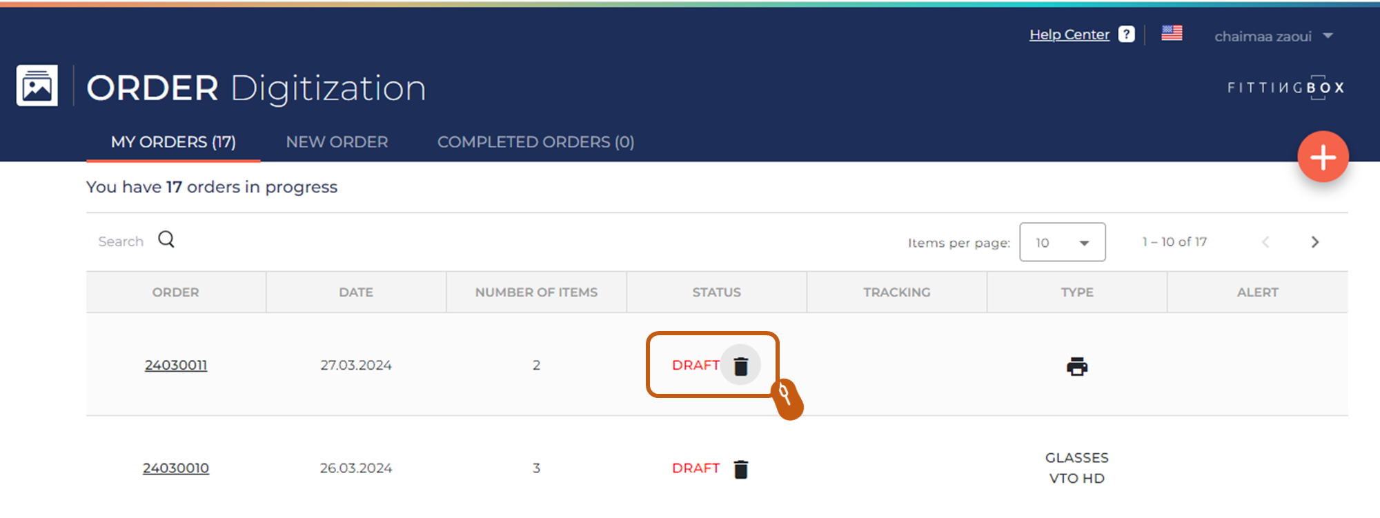 You can create an order by clicking on the “new order” tab or the "+" button at the top right of the page.