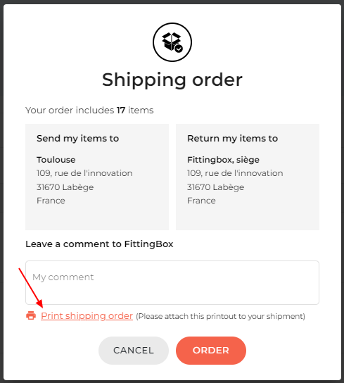 - Click on "Print shipping order" at the bottom of the pop-up window.
