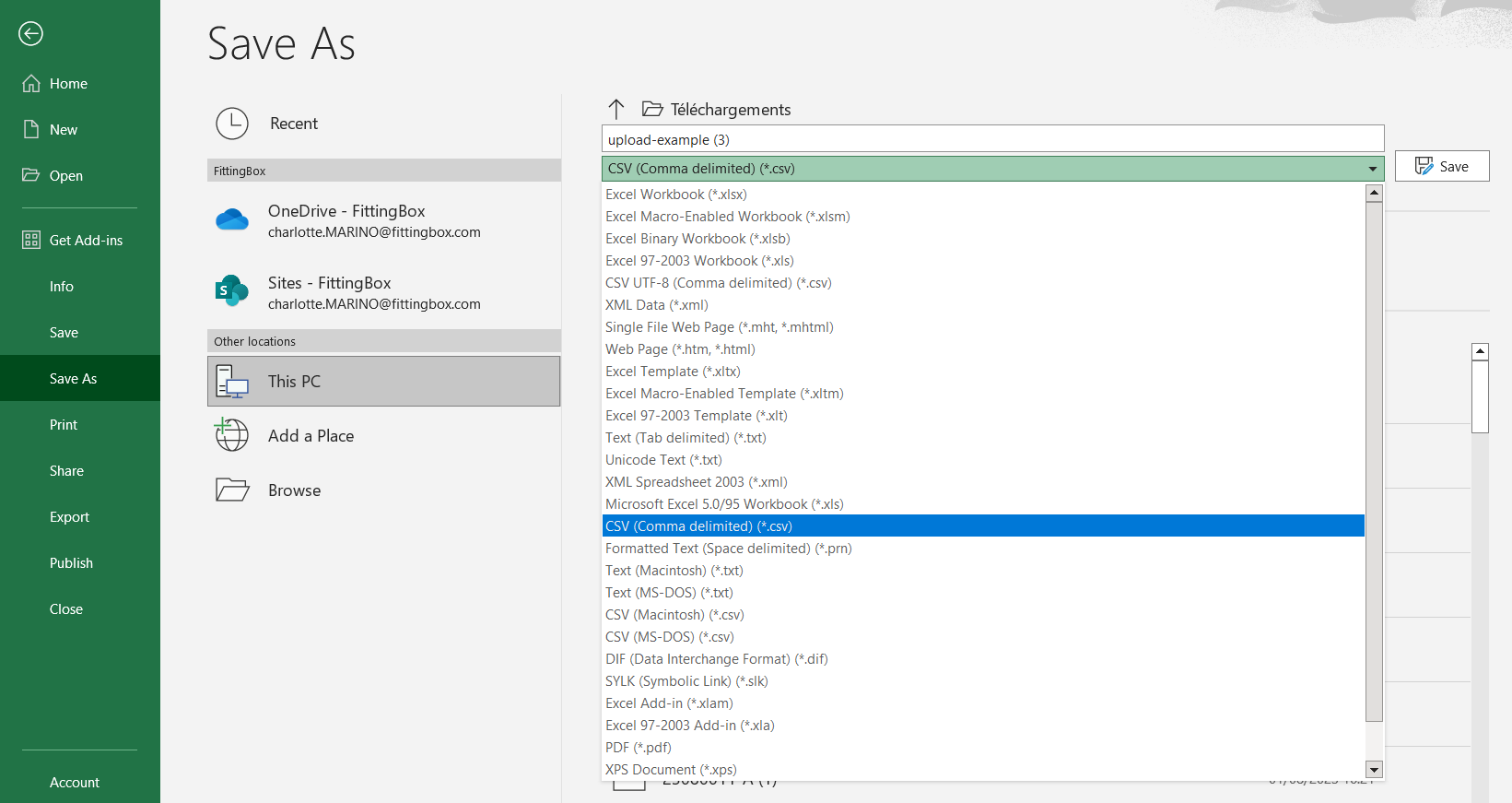 To save with the right format of csv (semi-colon) select the same choice bellow: