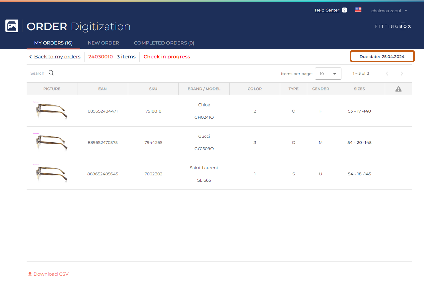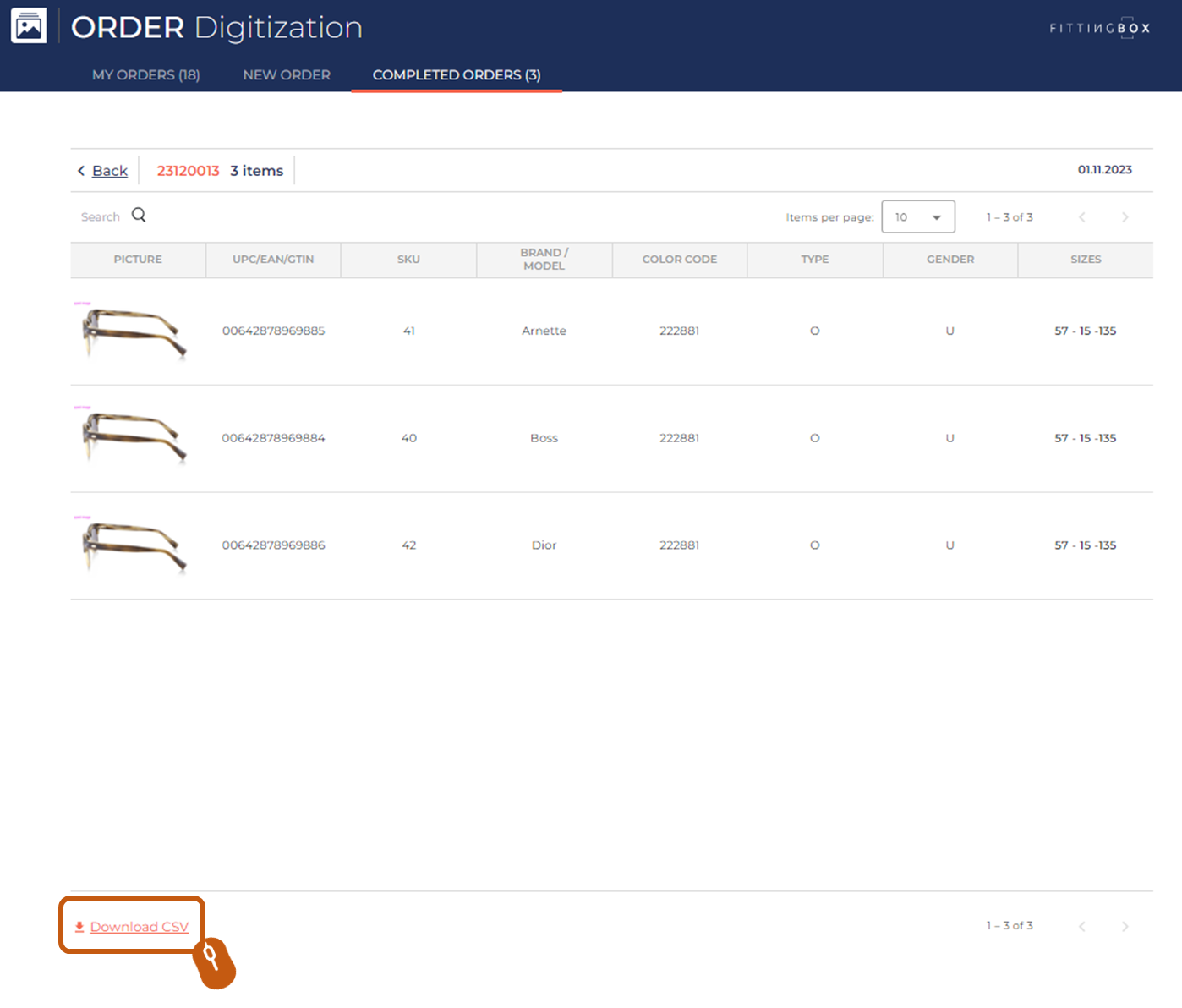 When opening a completed order, you can view all you items, and you have the possibility to download a CSV containing the list of you items.