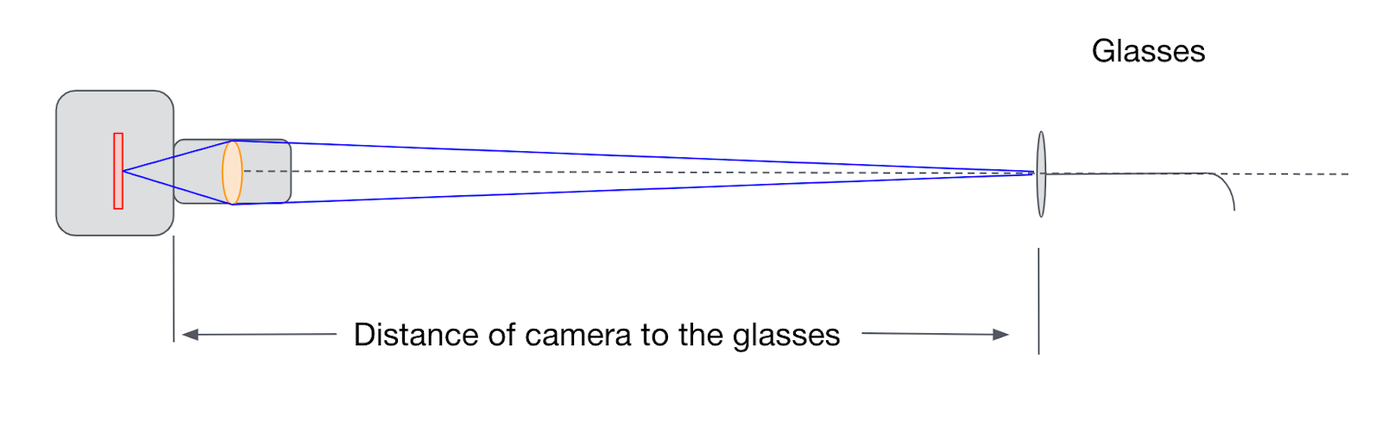 Setup the glasses in the top-down view first (using the riser triangles) and move the camera back until the whole pair of glasses is visible with good margins. That will set the distance of the camera to the glasses. The distance of the camera is defined as the distance from the glasses to the camera body-lens connection point. The illustration below shows how to take this measurement.