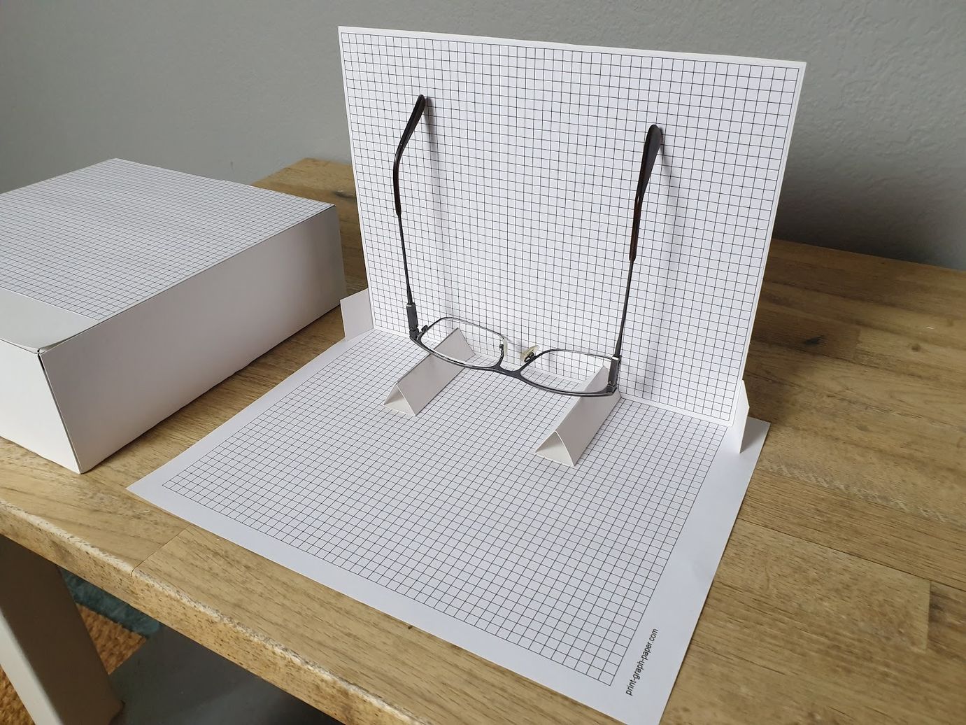 The goal of the following instructions is to make sure that the center of the camera sensor and the center of the glasses are aligned on all images. To achieve this goal the first step is to use a tripod or surface where the camera position is fixed as seen in the setup figure below. In order to ensure this for all views, two auxiliary objects are needed; a riser block (75 mm tall) and riser triangles (20 mm tall or 23.1mm each side) shown below.