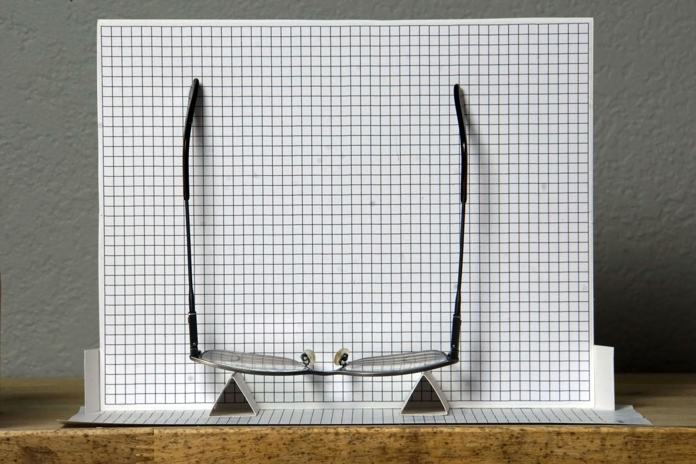 Starting with the camera lower than the glasses, raise it until the bottom of the glasses is visible. This should make the center of the camera and the center of glasses closely aligned. However, if there is any height difference, then this will define the height of the camera with respect to glasses. This can be measured by subtracting the height of the glasses center to the floor from the height of the camera lens center to the floor.