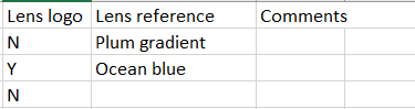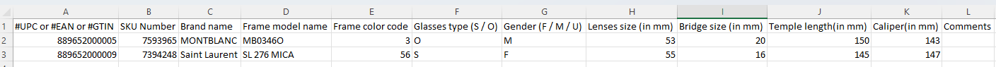 - Glasses type: S or O. There are 2 glasses types available: Sunglasses/Optical. Please add S for Sunglasses and O for Optical into the CSV.