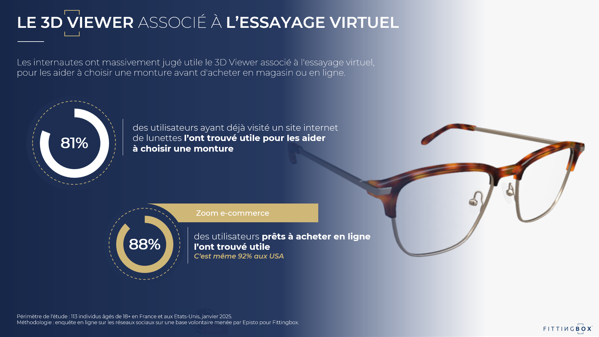 81% des acheteurs de lunettes en ligne ont trouvé que la visionneuse 3D associée à l'essayage virtuel était utile pour choisir une monture - avant d'acheter en magasin ou en ligne. L'impact est encore plus prononcé chez ceux qui sont prêts à acheter en ligne, puisque 88% d'entre eux le trouvent utile, et même 92% aux États-Unis.