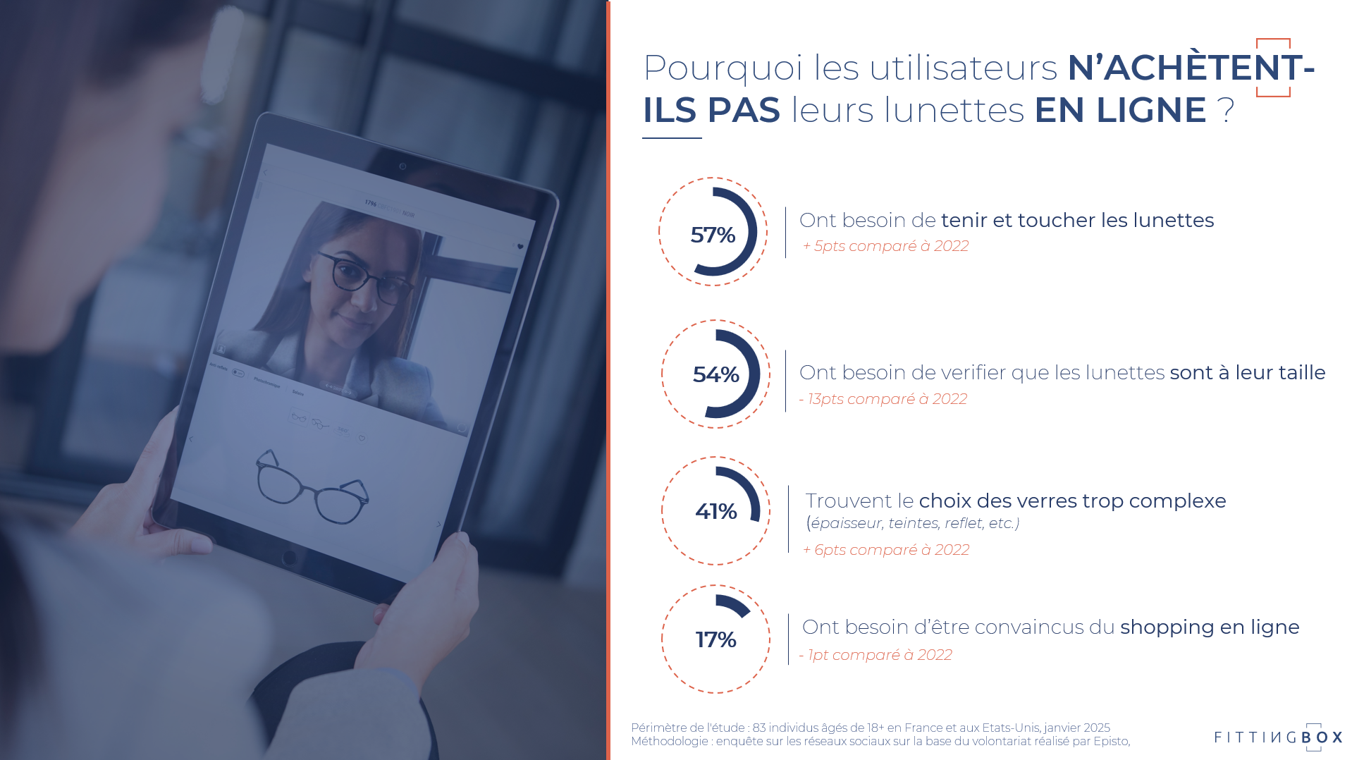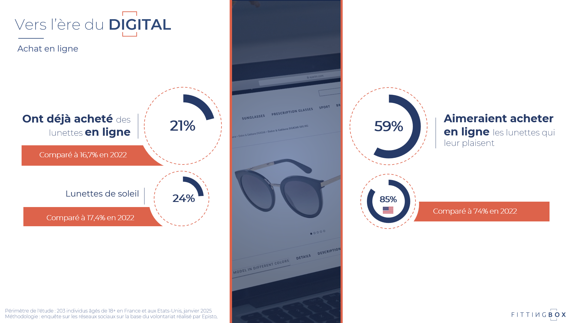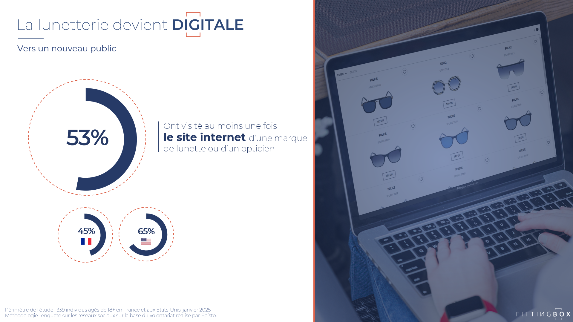 L'étude a porté sur 339 acheteurs de lunettes ayant acheté des lunettes en magasin ou en ligne au cours des cinq dernières années et âgés de plus de 18 ans en France et aux États-Unis. Parmi eux, 113 répondants ont visité au moins une fois un site web de lunettes. Réalisée en janvier 2025 par Episto pour Fittingbox, l'étude est basée sur une enquête en ligne distribuée via les réseaux sociaux sur la base du volontariat. Les résultats de l'étude 2022 sont disponibles ici.