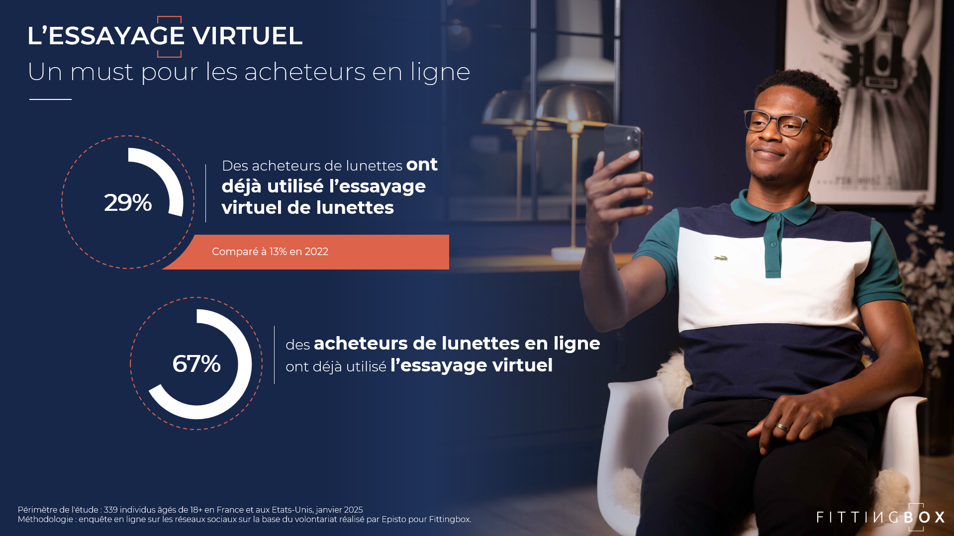 Lorsqu'il s'agit d'acheter en ligne, les comportements des consommateurs évoluent constamment, et l'optique ne fait pas exception à la règle. On peut dire que l'émergence de nouveaux outils digitaux a influencé le parcours d'achat. Selon une étude en ligne menée par Episto pour Fittingbox en janvier 2025 aux États-Unis et en France, 29% des acheteurs de lunettes ont déjà utilisé la technologie d'essayage virtuel au moins une fois, soit plus du double par rapport aux 13% enregistrés en 2022. Cette augmentation montre qu'un nombre croissant de sites de lunettes propose désormais cette fonctionnalité - 215 millions d'essayages virtuels ont été réalisés dans le monde par Fittingbox en 2024, soit +49% par rapport à 2023 - , avec en revanche une portée globale encore limitée par le fait qu'à ce jour, seul un acheteur de lunettes sur deux se rend en ligne pour chercher des lunettes. Analysons cela en détails.