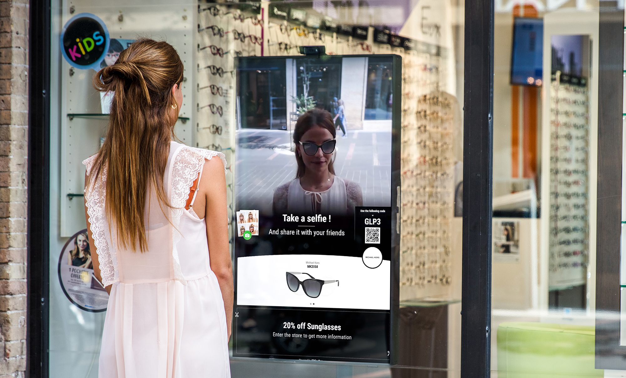 FittingBox Standard pour Vitrines est une vitrine interactive spécialement conçue pour l’essayage virtuel de lunettes. Elle permet aux passants d'essayer numériquement des montures en 3D, depuis l'extérieur de votre magasin, et de partager leur expérience sur les réseaux sociaux. Cela permet d'attirer l'attention et de séduire les acheteurs en mettant en avant des paires de lunettes de manière originale. OWIZ Street peut aider les magasins à se démarquer de la concurrence, à diffuser vos offres commerciales (24 heures sur 24 et 7 jours sur 7) et à proposer une expérience immersive et mémorable pour les porteurs de lunettes.