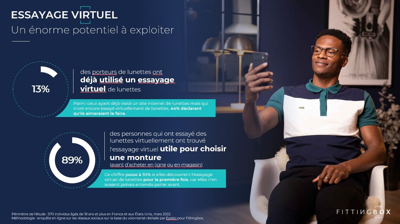 Selon une enquête en ligne menée par Episto pour Fittingbox en mars 2022 aux États-Unis et en France, une grande partie des porteurs de lunettes ne semble pas connaître les services d'essayage virtuel, même parmi ceux qui ont déjà visité des sites e-commerce de lunettes. 41% des porteurs de lunettes n'ont jamais entendu parler de l'essayage virtuel de lunettes, et ce chiffre tombe à 26% parmi ceux ayant déjà visité le site internet d'une marque ou d'un commerçant de lunettes.
